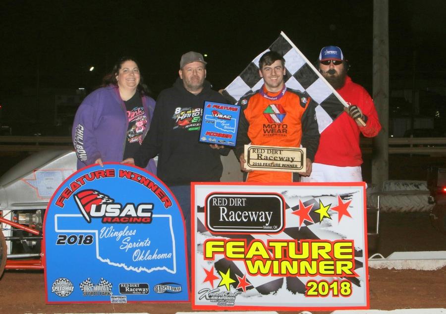 Meeker, OK……..Brett Wilson of Coweta, Okla. captured Friday night’s 25-lap USAC Wingless Sprints Oklahoma opener at Red Dirt Raceway. He passed Casey Wills on lap six and led the rest of the way to beat Danny Smith, Johnny Kent, Joe Wood Jr. and Ty Hulsey. Tri-State Claims awarded Wilson an extra $100 for a “clean sweep” while Hardwood Innovations also split $100 in bonus money to three feature competitors. The series continues April 20 at Creek County Speedway in Sapulpa, Okla.
